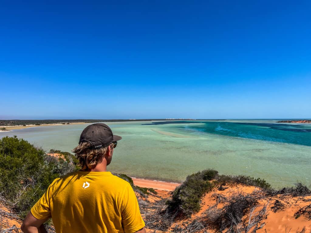 The next morning, we officially crossed into the northwest and made our way to Big Lagoon. This gem north of Denham is part of Shark Bay’s World Heritage area and a kiter’s dream: clean wind funnelling straight through the middle of a west-facing lagoon, with a deep blue channel flanked by sandy shallows and seaweed-fringed edges.